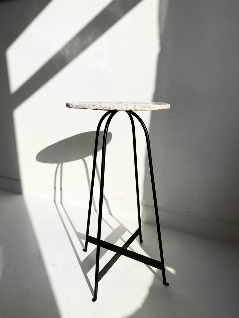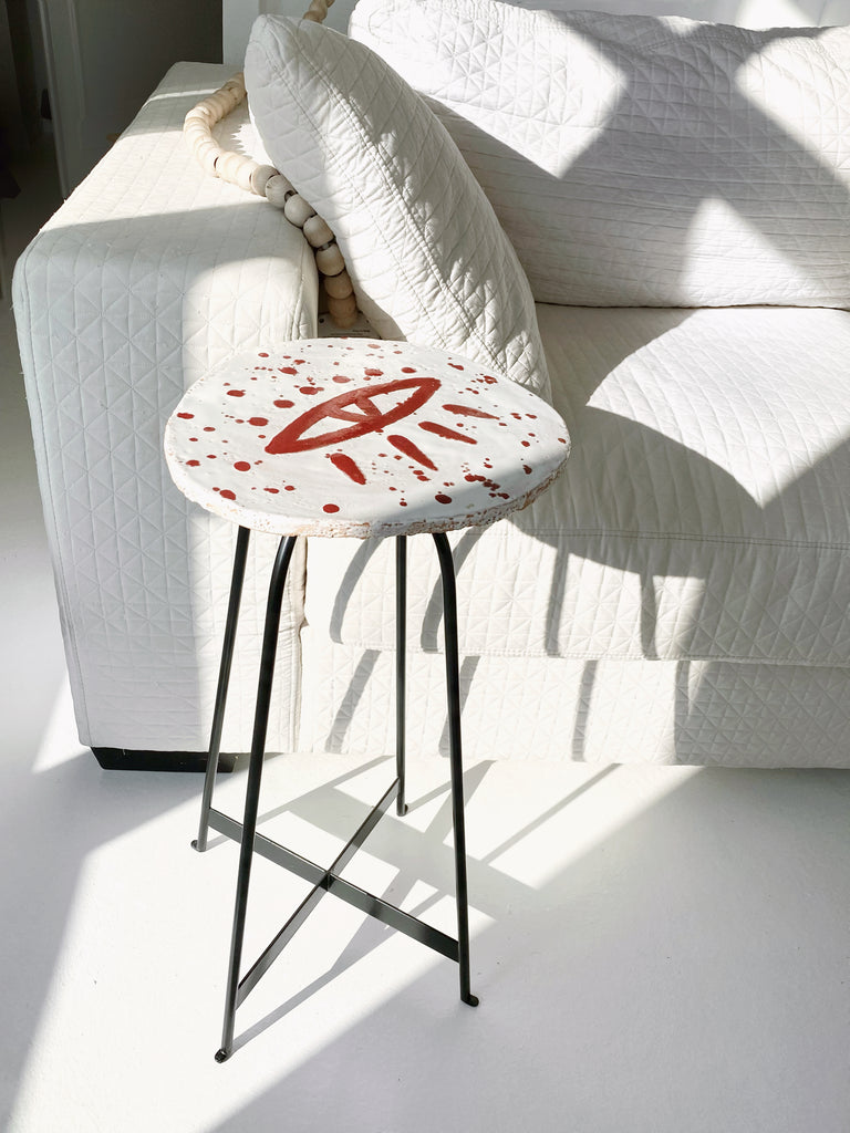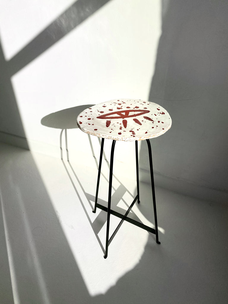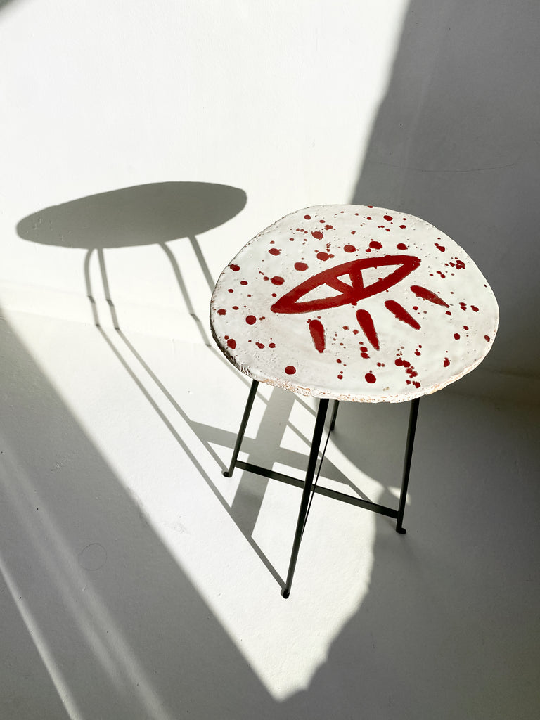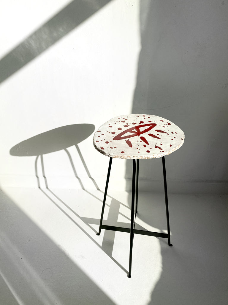 Şamotlu çamur üzerine, beyaz ve kırmızı sır kullanılmıştır. Ayakları siyah demirdir.
